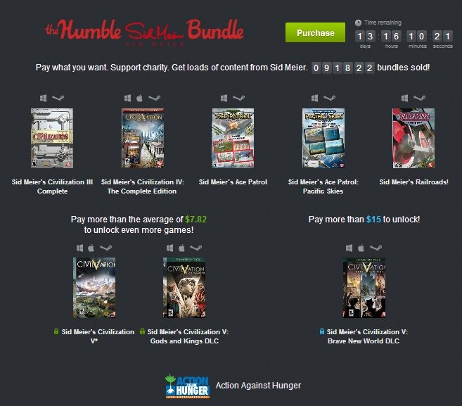 From now until Feb 18, 2014, Humble Bundle has several Sid Meier games for sale. Name your price, and help Action Against Hunger.