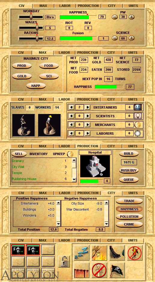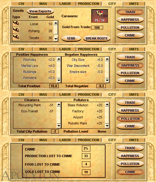 The various forms of the city tab. An interesting aspect of CTP is that you can see exactly how big a happiness or a pollution problem is.