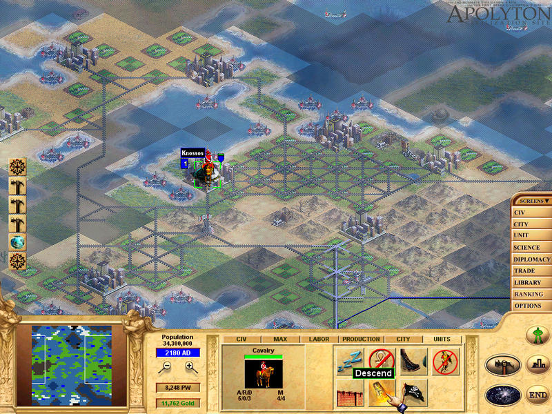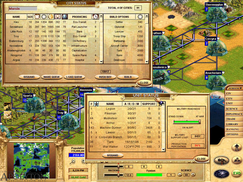 What is not done from the tabs, can be done from the various screens. Clicking on the "screens" button on the right, shows a menu with the various screens: Civ(same settings you can do with the Civ tab, but with more information plus the screen where you can change you government), City (a list of your cities with details on gold, science output, etc), Unit(listing of your units and the choice on the level of alert your units are at), Science(change what you research, see which advances you have and other civs don't, and the opposite), Diplomacy (communication with other civs, information on what treaties you have signed and when they expire, their attitude to you and others, which cities have the most pollution, and more), trade (thank God (or Activision), there is an "advisor" which suggests exactly what you should do, what kind of routes you should create, etc), Library (civilopedia renamed), Ranking (powergraph, best cities, etc) and finally Options (load/save, graphics, sound options, etc).