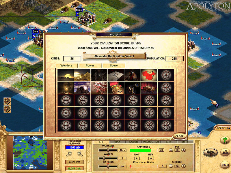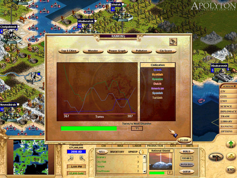 A thing I've liked, beyond everything else I mentioned in the previous paragraphs, is that you if you're in a winning position the game is not won for sure, but you might have some surprises. For example, in a game on a small map, some time in 1700's I was winning the game, nothing could stop me, when I reached the 30 cities limit of Republic. I would have problems if I captured more cities and I hadn't discovered a more advanced government. Or something like that could happen with pollution. In my last game I tried to avoid a disaster but at the end I didn't. The ozone layer was destroyed, and I lost 20 cities(!) because of the raise of the sea level! I was still in a "nothing could make me lose" position though. In another case I might not be.