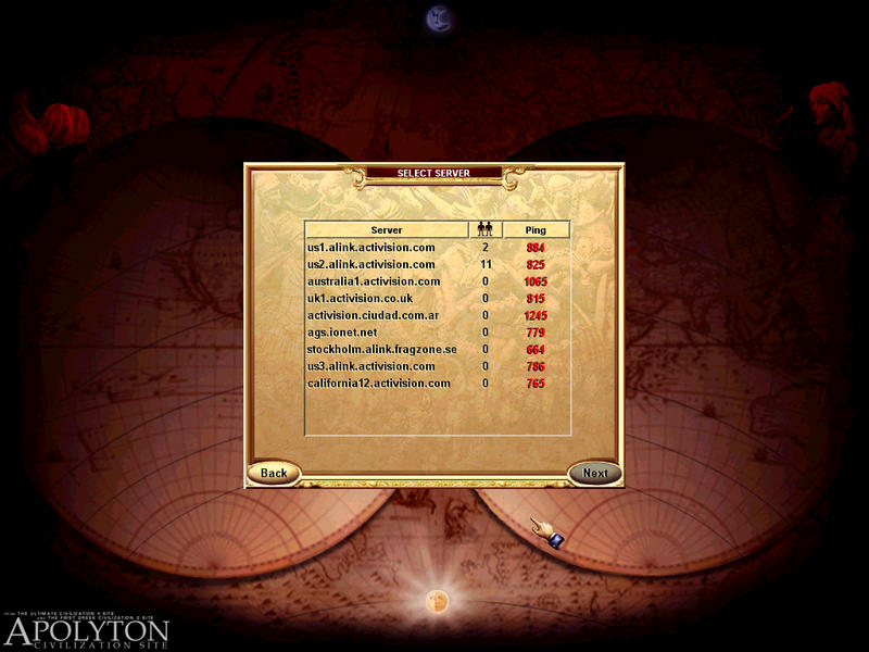 Other than that, CTP supports Internet, TCP/IP on LAN and IPX. Hotseat and a Play By E-Mail will be added with a free downloadable patch. For the most used option, Internet, CTP has an integrated matchmaking system. Certainly the best feature about multiplayer, you're presented with a list of Activision's servers around the world, showing how many people are on each server and what's your speed with it. On each server, there can be several lobbies where you arrange games and chat with other players.
