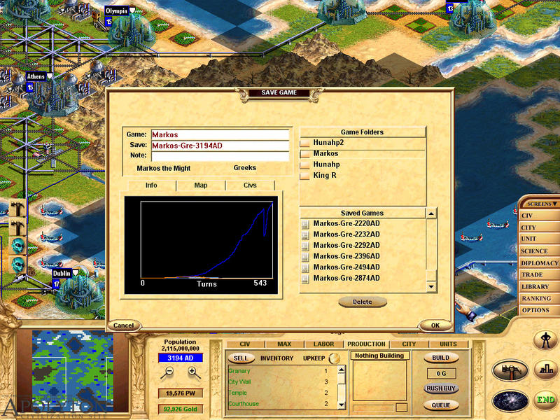 Other than that, there is a lot of stuff in text and common graphic format (tga). Starting from the number of simultaneous civs in a game (up to 32!!), to the names and the cities of the civilizations, to the colors that are used by each civ, to how many turns the ages last, to units and advances, even some of the AI behavior can be tweaked from a text file.