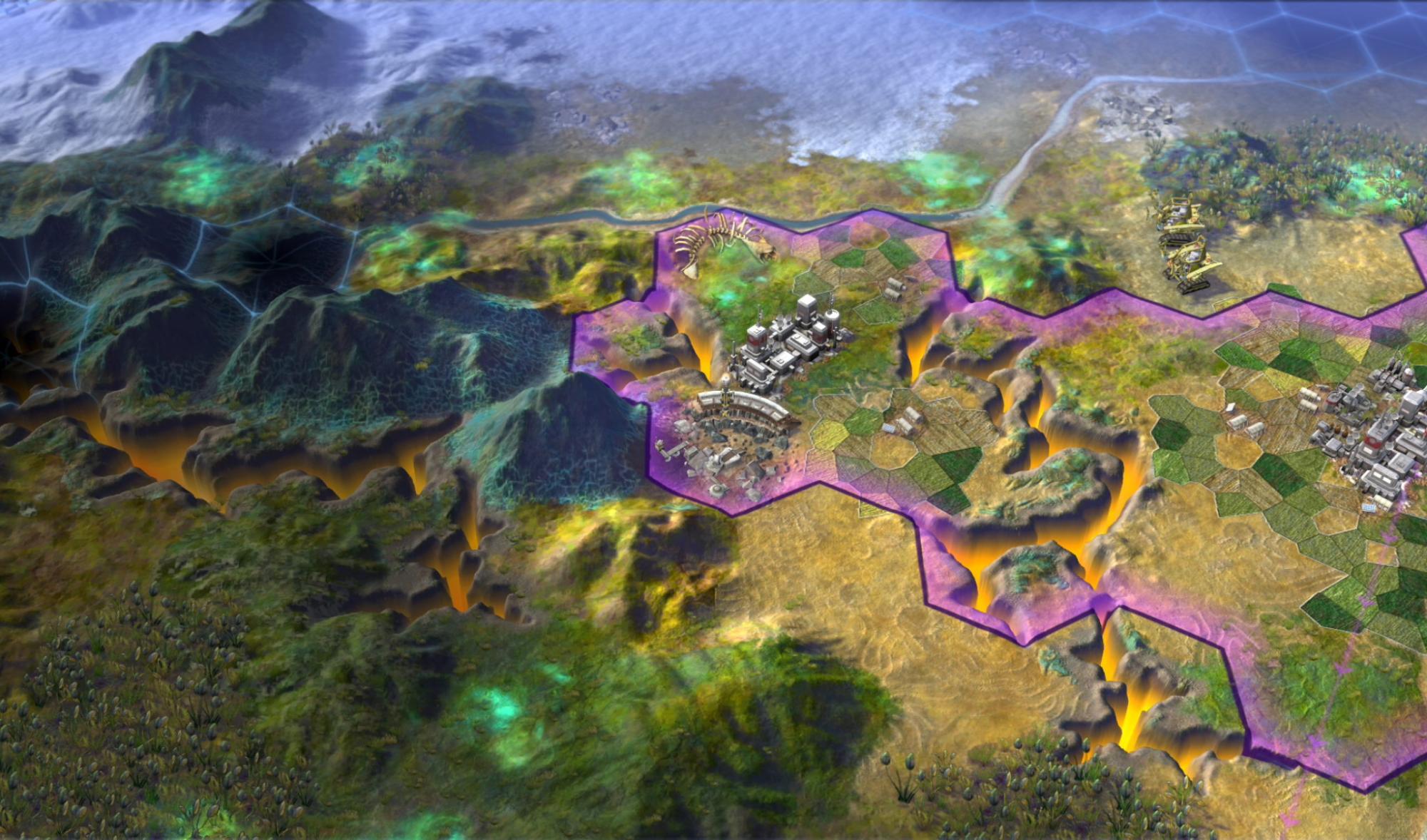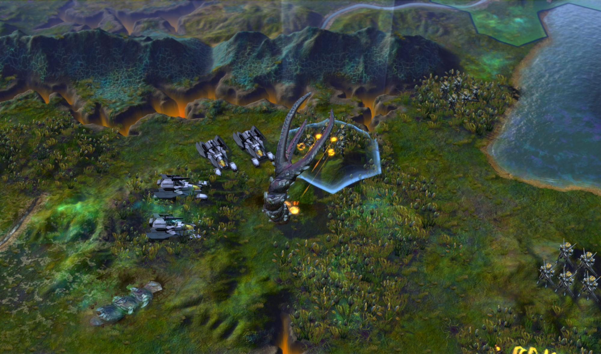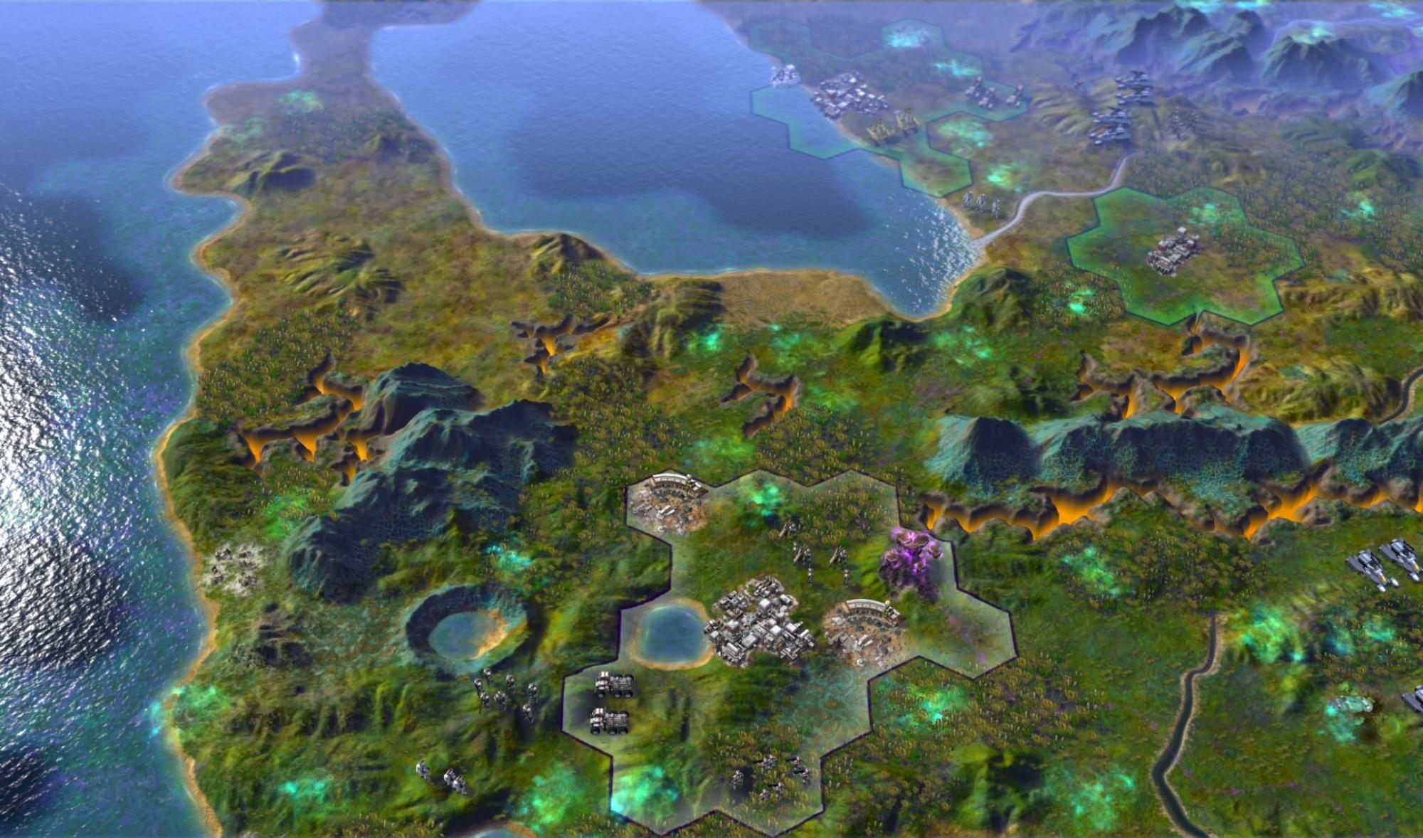 On terrain, he mentions that the glowing green miasma apparently damages units who breathe it for too long. Later in the game, you'll be able to harness power from geothermal vents in the canyons we've seen. There will be a desert biome, a Vulcan biome full of fungus (not volcanoes?), and an aquatic biome as well. It doesn't sound like those choices are all there are.