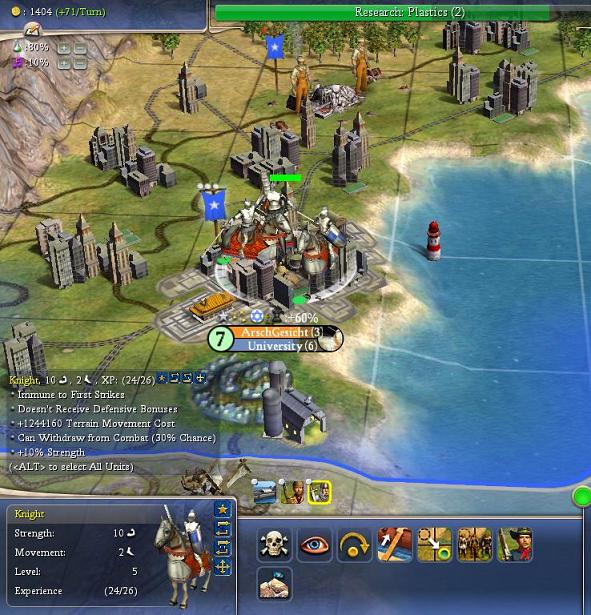 • Here's an interesting one; look at the "Terrain Movement Cost" for the knight from a mouseover. Looks almost like a signed Int wrap-around. I didn't see whether it had any actual game-effect since I upgraded the knight and haven't moved it yet, but mayber it means he can't move ;-)