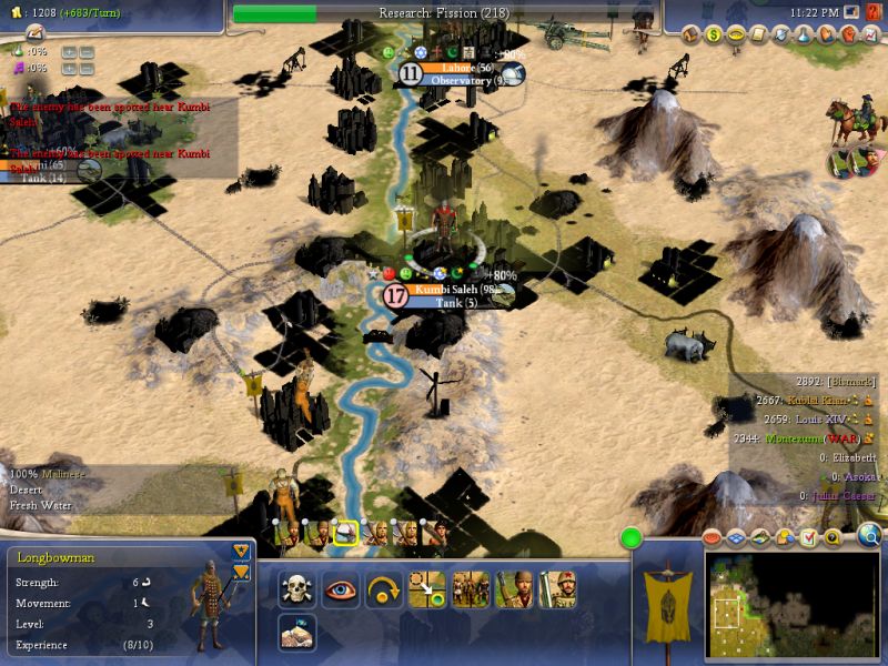 I'll post a couple of screenshots. I'm open to suggestions. This first screen shot is earlier in the game. I took it to show off the screwed up graphics in this game. My name is Bismark, but I chose random civ. I'm not the germans, but the Mali.