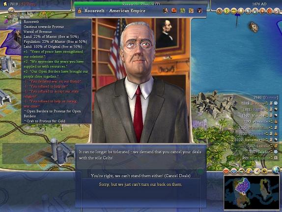 The subject is Vassal States and Defense Pacts. Here is the situation I faced. I need space on the other continent to complete a domination win. The other continent had four AI players. Ragner was in peaceful Vassalage to Huana Capac. Huana was in Defense Pact with Shaka and Alexander. I was big enough to take on any one of them, although Shaka would have been a big challenge. I was probably big enough to take on two of them if one of them wasn't Shaka. I definitelty did not want all four coming at me. Everybody was my religion and everybody was all friendly or pleased with each other, even with me as I had been invading infidels. So I couldn't leverage any diplomatic issues.
