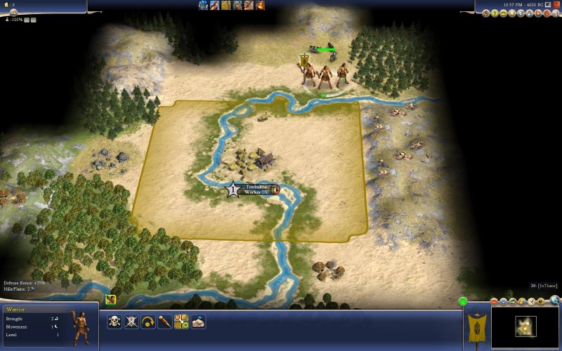 Map is Medium continents, I'm playing Mansa Musa, and I think difficulty is set to Noble. Raging barbarians are turned on. From my fat cross starting square, my terrain is as follows:
