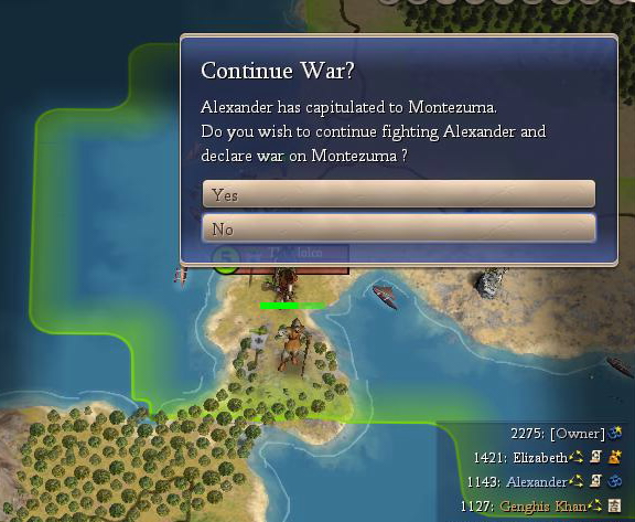 There was a major world war going on with Wang Kon (with his vassals Monty and Shaka), Frederick and my minions (Ghandi with vassal Peter) independently beating up on Isabella. While this war was going on, Fred and I got into a tussle as well and Wang (seeing an opening) joined in on my side. In an attempt to avoid anhililation, Izzy became a vassal of Fred. The war continued with Wang & Co. and Ghandi's Gang kicking major Spermanish butt. After losing much territory their vassalage was dissolved. Fred ran to Wang with his tail between his legs and became his vassal, leaving Izzy on her own. Izzy promptly made peace with Wang. But now, without asking me, peace is declared between Ghandi and Fred and Izzy and my forces are removed from their territories. OK, Wang and I are on good terms and I would have made peace with his vassal, but I would have preferred to keep fighting Izzy. As it is, I immediately declared war on Izzy and brought my forces back into play, but her eventual anhiliation has been delayed by this temporary (and undesired) peace.