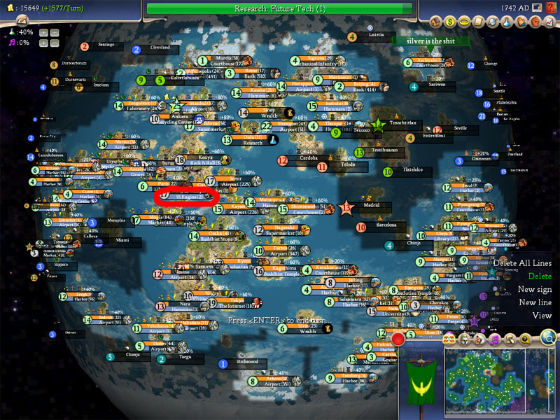 The experiment for this particular game was to always expand by any means necessary so that my science rate could never exceed 60% due to the cost of maintenance of new cities.