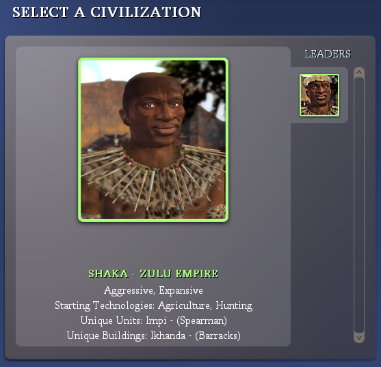So I started playing a game of Civ on my wife's computer, and met our old "friend" Shaka Zulu. The thing is, his head's messed up! What happened to his Zulu headband-thingie?