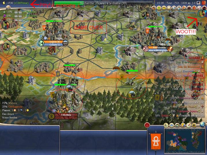 UPDATE ß : The german attacked me and that hurts... they captured my two northern citys which i could take back with extreme losses. In the mean time, Izzy got free from vassalage and the first thing she did was declaring war on me (déja vu? ) I'm still far behind in techrace and Mansa made me an offer that I couldn't refuse... he gave me 1000G and Printing in exchange of astronomy. As he is still having trouble with the byzantine cathaphracts and their cannons (! he beelined steel !) i shouldn't worry to much. Anyway... Izzy took Rouen, the small frensh town you can see totally submerged by my culture and tries to attack Hippo, my main military production city and makes great losses trying. I will help my vassal out now because i just signed a peace-treaty with the german who were visibly affraid of my (small) tech advance on them, because they offered me evrything sparable for letting them alone (gold, map, gold per turn). My vassal is doing well besides the loss of Rouen. In deed, he managed to take 3 russian citys and to creat two new ones in the middle of the jungle. With my tech backup, he should be a great ally over time. I'm 10 turns from beeing the first to get economics... damn this will be good!