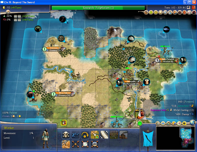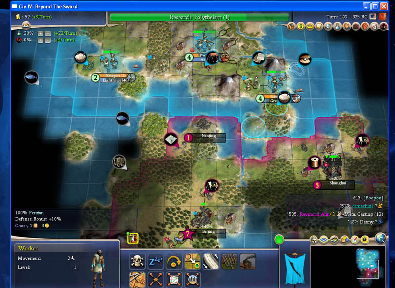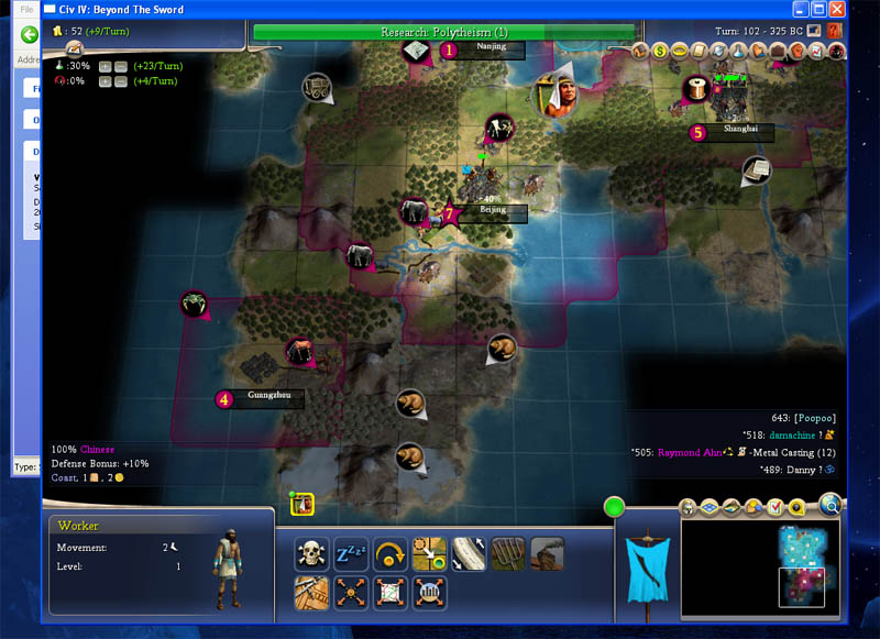 4 player + 3 AI game on tiny map continent. yeah i know. Other games so far has been standard w/ AI or small w/o AI. We figured the uber crowded tiny game would go faster. This is the first save after ~1 hour of play tonight.