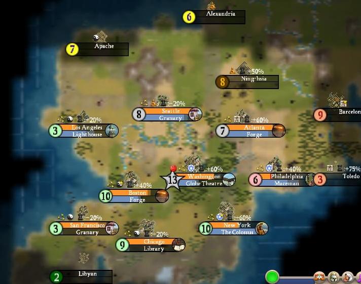 The completion of the Hanging Gardens has created an unhappy citizen in Washington, but that will be fixed in a turn or two; the gold mine near Los Angeles just completed and now just needs the road.