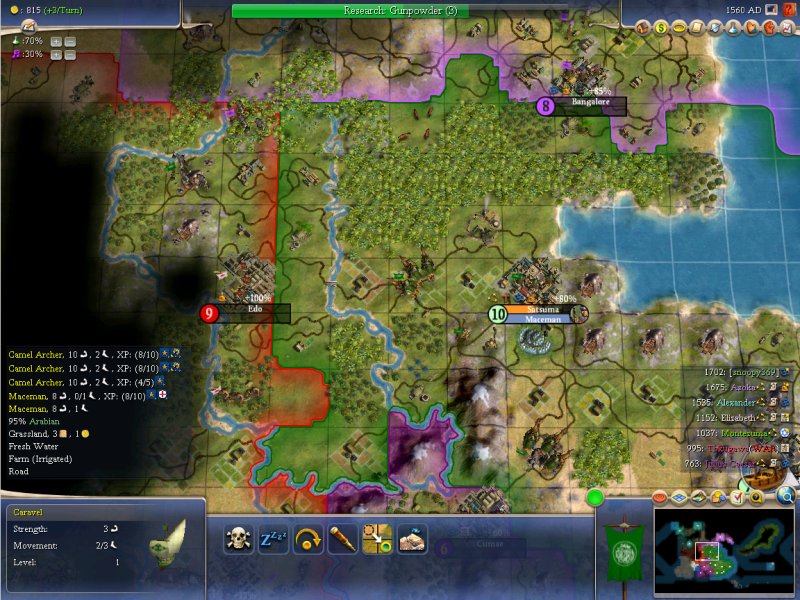 Alexander is also Hindu, thanks to my conversions, and Asoka may follow suit soon (going to convert a few more of his cities post-war). I'm also in the process of weaseling Bangelore away from Asoka, which will weaken him considerably, although he has a LOT of cities; Bangalore has several valuable happiness and healh resources.