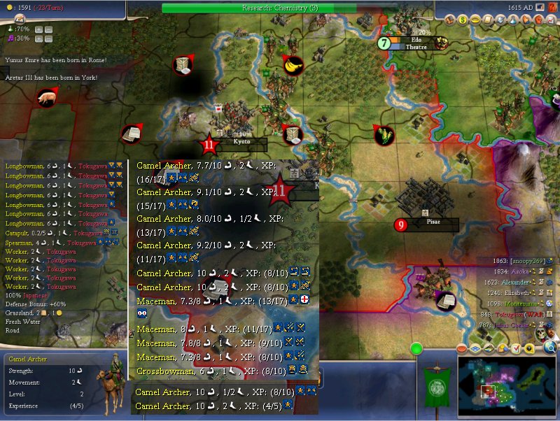 The pasted parts are my units - in two stacks. The lefthand unit list are the Japanese. They attacked once already with a catapult, that withdrew and did small bits of collateral damage to various units (6). I probably should have moved the units that got there early down to another square or two... hard to get used to the fact that, unless you have a unit that's city raider, it's to your advantage generally for the enemy to attack you out of the city (since units have same att/def value), and thus no reason to leave in a stack (at least not with these units, camel archers are fine with being attacked)...<Reverend> IRC is just multiplayer notepad.