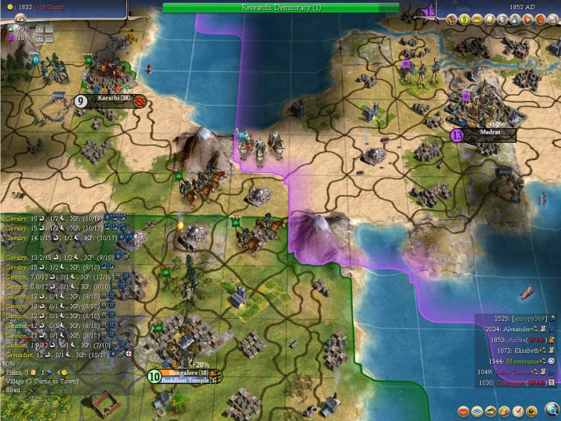 India I held out for a long while with. I never took another city, though I did help to raze Madras. I basically pillaged and pillaged until I got bored and made peace for 4gpt and 20gp (all he had). Alexander is still going strong in that region, and post-Madras I have nothing to worry about from India (no common cultural border, at least on land) and Alexander is looking to be getting a bit strong militarily ... I only share a bit of border with him, Lahore/Kagoshima in the west, and it's not an area I care much about (though I like the marble); but I'd rather stay friendly with him, and I'd certainly rather him have a harder time killing India. Infantry are going to be hard for him to take no matter what ... though India has no production ability now due to the pillaging.<Reverend> IRC is just multiplayer notepad.