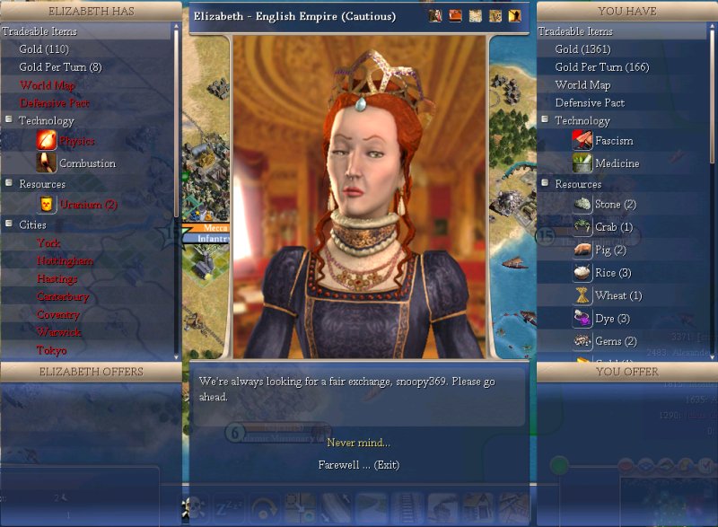 First tech they've been willing to trade me (excepting Asok, who always listed them as willing but never accepted a peace deal with them) since ... um ... wow, a LONG time ago, maybe AD 500 or something. Certainly since Education, but I'm fairly sure it went much further back than that.<Reverend> IRC is just multiplayer notepad.