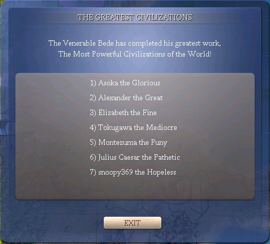 I am now at war with Japan for the second time. There are three civs - Japan, Rome, and Aztecs - who couldn't beat me under any concievable scenario. The Indians are the only ones i'm worried about, and i'm carefully keeping them very, very happy.
