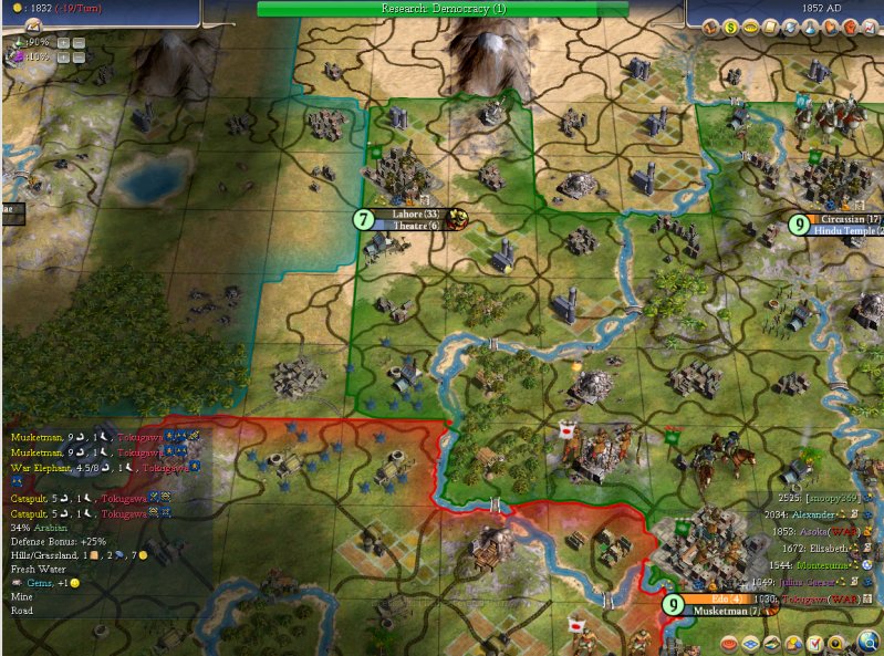 India I held out for a long while with. I never took another city, though I did help to raze Madras. I basically pillaged and pillaged until I got bored and made peace for 4gpt and 20gp (all he had). Alexander is still going strong in that region, and post-Madras I have nothing to worry about from India (no common cultural border, at least on land) and Alexander is looking to be getting a bit strong militarily ... I only share a bit of border with him, Lahore/Kagoshima in the west, and it's not an area I care much about (though I like the marble); but I'd rather stay friendly with him, and I'd certainly rather him have a harder time killing India. Infantry are going to be hard for him to take no matter what ... though India has no production ability now due to the pillaging.<Reverend> IRC is just multiplayer notepad.