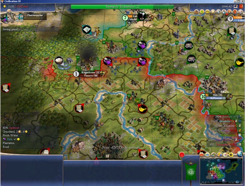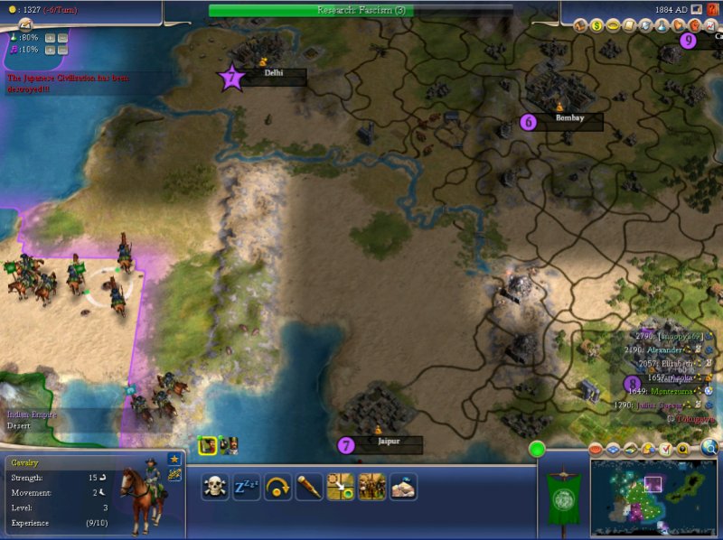 Anyway, I took the new Japanese city of Kagoshima, settled near where Osaka was razed not long ago. I decided to keep it, for some odd reason; haven't quite figured that one out, but I was thinking I believe that I would work out a way to get that marble still ... Lahore isn't pushing hard enough culturally yet for it. Next stop is Kyoto (Again...) with cavalry, I have maybe 10 in the area, which might be enough. If it's not (i'll take a look at the city next turn), I'll wait the seven or eight turns until the cannons appear