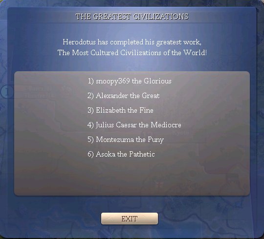(They won't make peace this turn, but I seriously hope the AI realizes it needs to make peace, since the #1 and #2 civs are currently 1/3 to 1/2 of the way through wiping them out ...