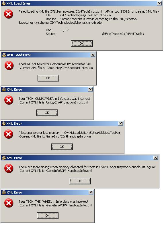 OK, quickly loaded the new one, and it seems to be working fine. It was a really silly error, as it happens. A single line I got wrong in Civ4TechnologiesSchema. It was supposed to be FirstTrade, but I had repeated the Trade function.