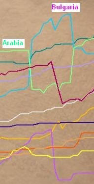 Choson - 13 Arabs - 11 (+2) Bulgaria - 11 (+1) Inca - 10 China - 10 Kushren - 9 (+3) Vikings - 9 (+3) England - 7 India - 6 (+1) Egypt - 6 Celts - 6 (-2) Carthage - ? (help me out i can't see their city list since they are a vassal)