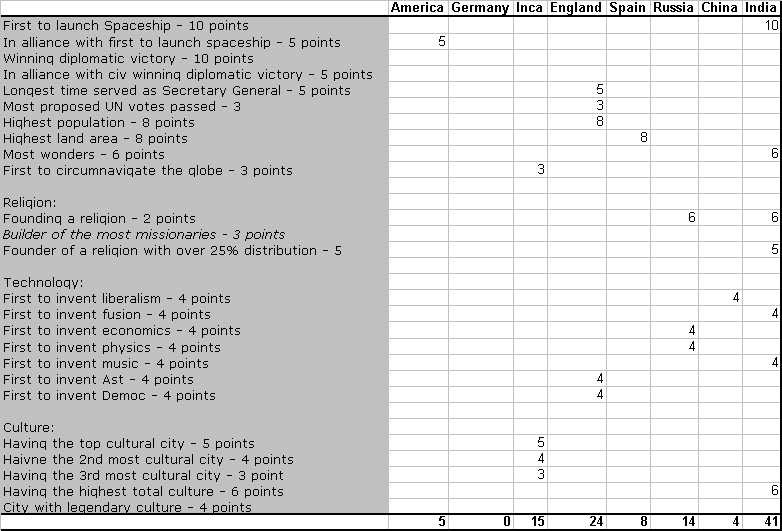 I think this provides for a good mix of real victory acheivements, other in-game achievements, and rewards for meta concepts like war, diplomacy, and storytelling.