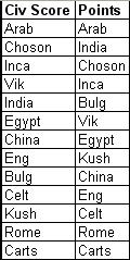 And as for points for wonders vs. land area & population. CS said that land area should be reduced since it is included in the score anyways. So are wonders. Plus Frank accuses the system of favoring builders I think, so cutting down areas like land area & population would annoy him more I think. So I recommend not changing that.