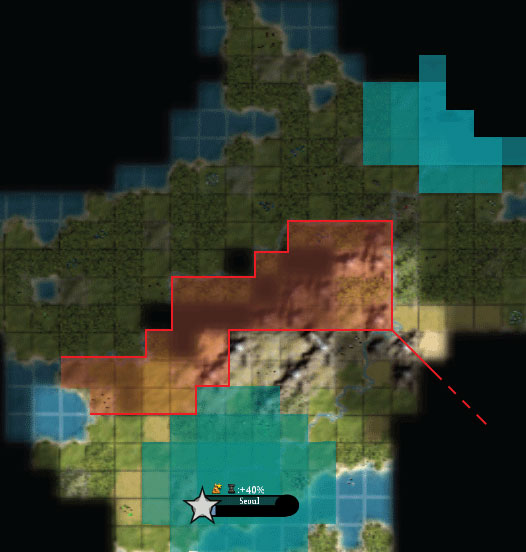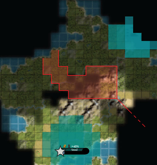 For clarification, the Corean envoy presented a map of the proposal. The shaded area would form a buffer zone where neither nation could place a city, and the as-yet-undetermined border in the east would follow the line of the Baekdu Mountains to the sea.