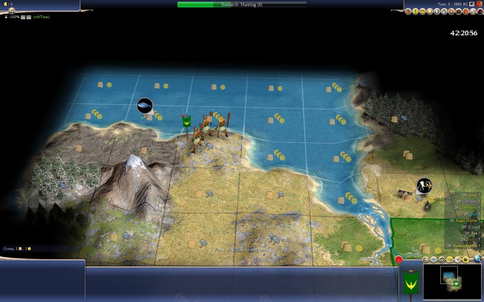 I played a bit before testing the "fishing before pottery" and settle near the fish first. result: very close to the first gameplay. the fishing path at t50 a bit ahed in science, has more spread cities, but the other (the old way) has more advanced cottages and has better science capacity. However looking at this new info settling 1 se of that wheat looks a good option even for second city. Going to try that.Captain of Team Apolyton - ISDG 2012