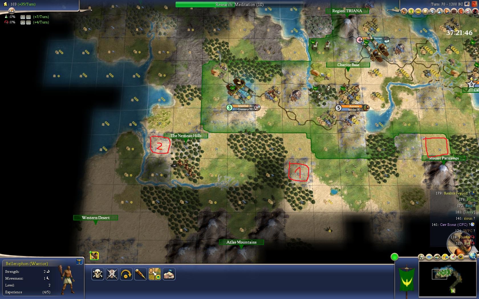 WRT build order. I like the idea of having a granary and a +2 happiness in each city with a hammam but I wonder if building those would not put us far behind in expansion. I suppose it would be ok though as we have the settler for the bronze city being built now though. I would like to see us start REXing soon after that though and to help happiness there is the fur near by which would give every city +1 so what do people think of only putting Hammams in cities which need them really soon and then building at least one more settler to take advantage of the furs? That would also help our happiness situation.Try http://wordforge.net/index.php for discussion and debate.