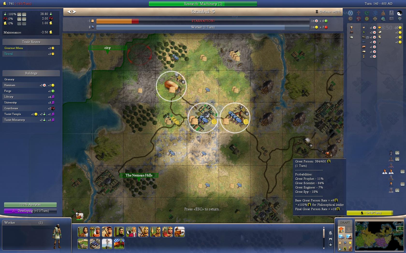* Diyarbakir: a city which also has been around for a while. It has just slaved, no worker in sight, while only 2! tiles have been developed. We get 3 hammers, while there is a tile with marble! and an excellent hill tile. And a missionairy needs to go there, to get +25% production.