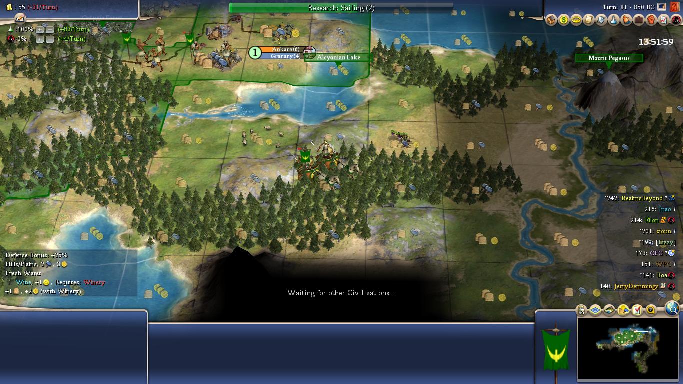 Our government is reestablished and we used our new slavery civic in 3 cities (Apolyton, Aurora and Istanbul) to rush build granaries. Port Boreas will join them next turn. The two small cities will too have granaries within 4-5 turns.