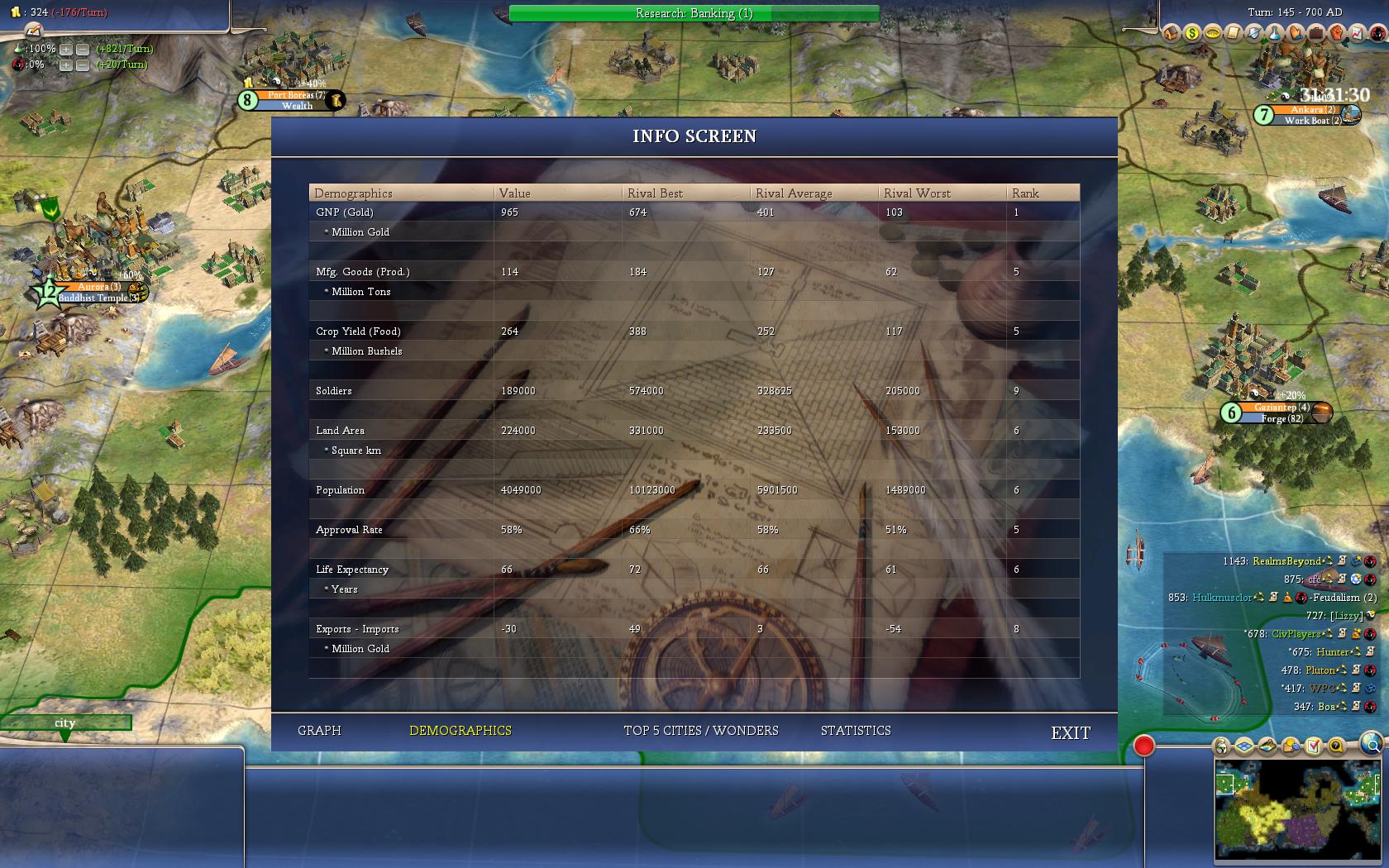 Also, something needs to be said about building those 8 universities and oxford. Holy crap, what a great achievement to get all that done in such a short amount of time! Definite congratulations are in order for that maneuver! Our research is fantastic! Am I right, from a previous demographics screen, that we now have the top GNP in the game even at a time when others are in a golden age? Great work.