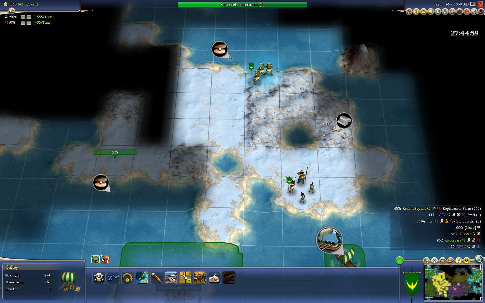 This turn we received the great prophet and a worker from Aztec, we send them the first cargo of riflemen. We have a sea route where our galley can go a full turnaround just in 3 turns and hopefully RB won't be able to see these transfers.