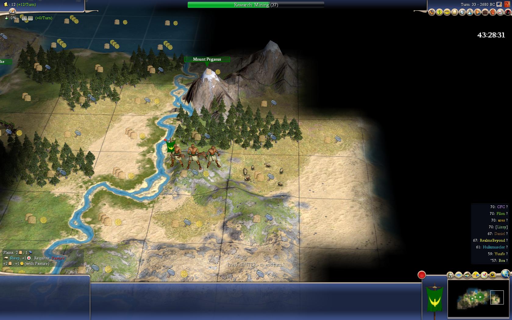 Right now it seems that if we go fo the horse city then we could build chariots sooner, then more settlers and then we need more workers and more units to defend ourselves and we must build these because there are hardly anything else to build. and all these just increase the maintenance cost slowing our science even more. And I think we should not allow that. There are too many usefull technology which would allow us to use our production better.. we need them all and as soon as possible. bronzeworking for chopping, mathematics for better chopping/hammam, code of lawas (courthouses), currency (more tade, turning production into wealth), a religion/org religion civic, monarchy(wine and civic), calendar(for the spice), etc.