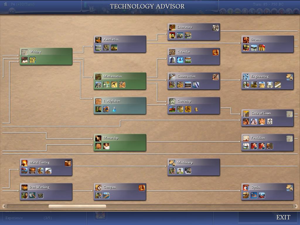 I think we are doing good in our given position, our land is quite challenging and probably less resource/commerce abundant than others'. The thing that we need more military, we need more land and we need more resources==cities and yet we already pay 60% of our income to maintenance is bad. Those who have more river, more luxury can easly get advantage. And yes CoL would be good to have, but other techs are as important too. sailing for example gives us 5 commerce/turn, Monarchy let our cities grow further etc.