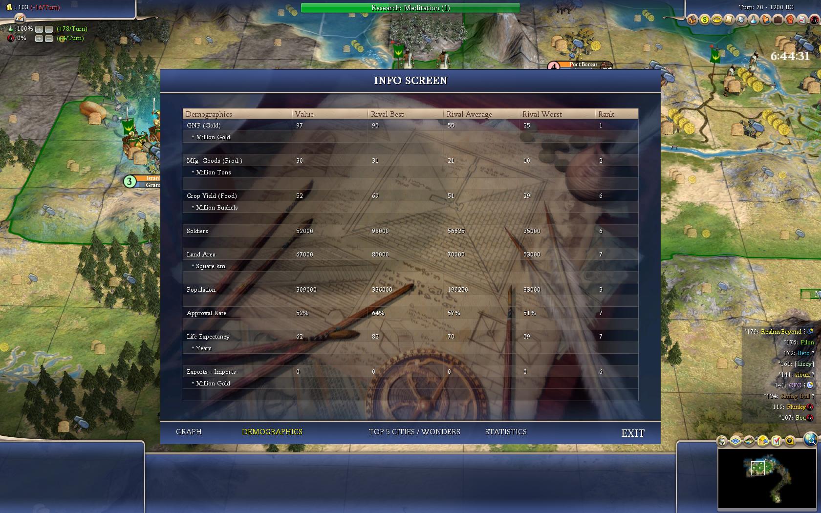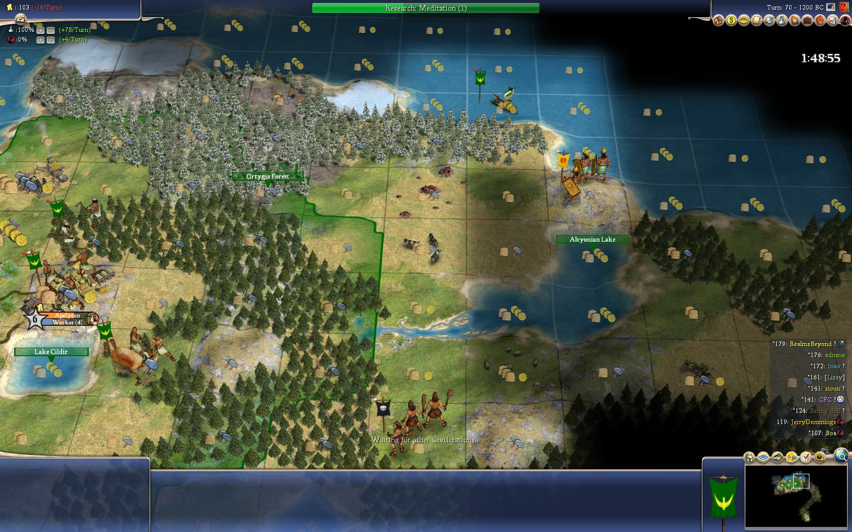 WRT build order. I like the idea of having a granary and a +2 happiness in each city with a hammam but I wonder if building those would not put us far behind in expansion. I suppose it would be ok though as we have the settler for the bronze city being built now though. I would like to see us start REXing soon after that though and to help happiness there is the fur near by which would give every city +1 so what do people think of only putting Hammams in cities which need them really soon and then building at least one more settler to take advantage of the furs? That would also help our happiness situation.Last edited by Dinner; November 25, 2012, 20:05.