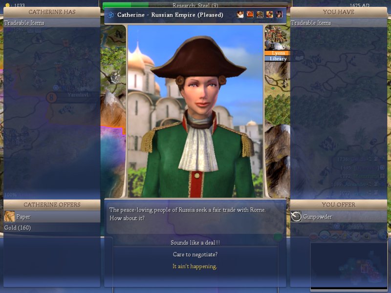 Catherine offers 160 gold and paper in exchange for Gunpowder