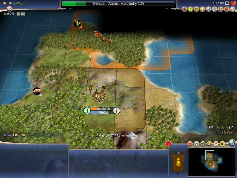 I opened the save up before work to start thinking about what to do. I will get our 2nd city up there to block Peter assuming he doesn't settle there first. I found a spot where we only need one culture growth to completely block land movement and will still have access to the 2 resources up there, forget what they are, pigs maybe and a luxury type?