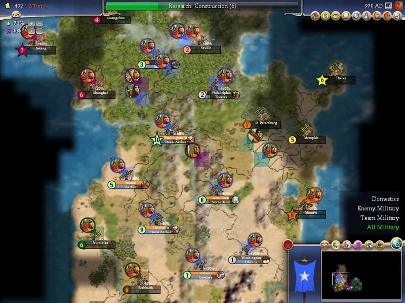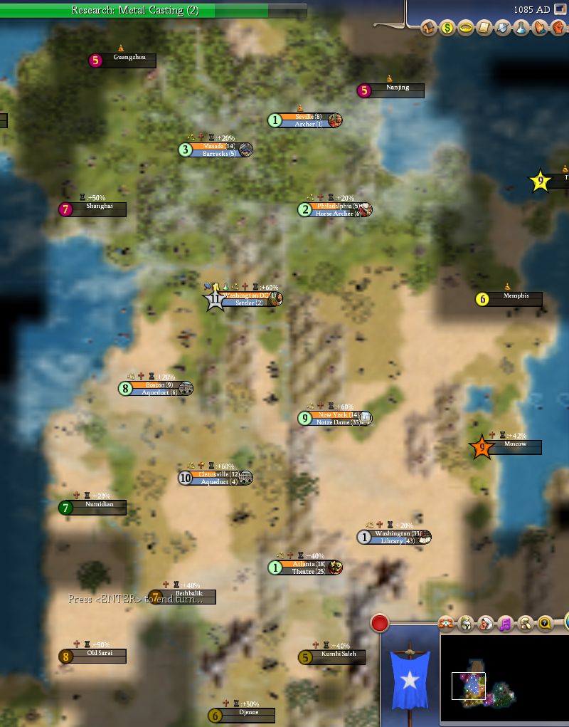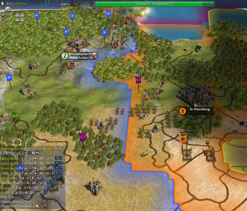 - The two Russian Archers that threatened Atlanta tried to walk towards Moscow, while protecting a Settler. They are dead now, and we have a new Worker (and some XP for our Horse Archers).