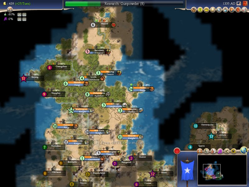 Chicago completes Longbowmen send toward Barcelona. Start a Granary.