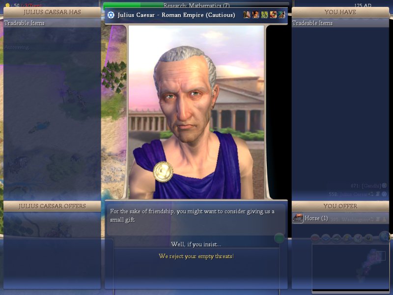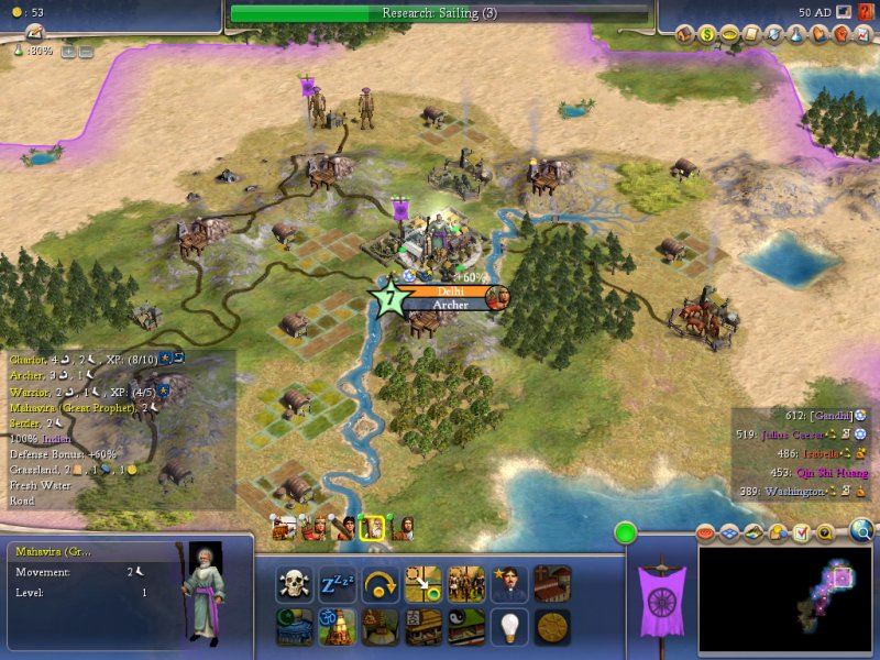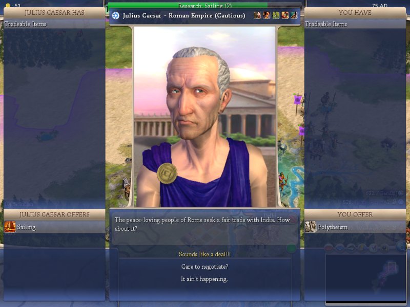 I'm most worried on defense going forward for the simple fact that Julius is obviously producing Prat's and wants horses--which we have. The other is that Isabella is, and will be, pretty ticked off and certainly not beyond launching an attack herself due to our heathen ways. Diplomatically we aren't well off with her and I don't see reason for that to change, however, she is on excellent terms with all the other civ's and, most worrisome, she has open borders with Washington.