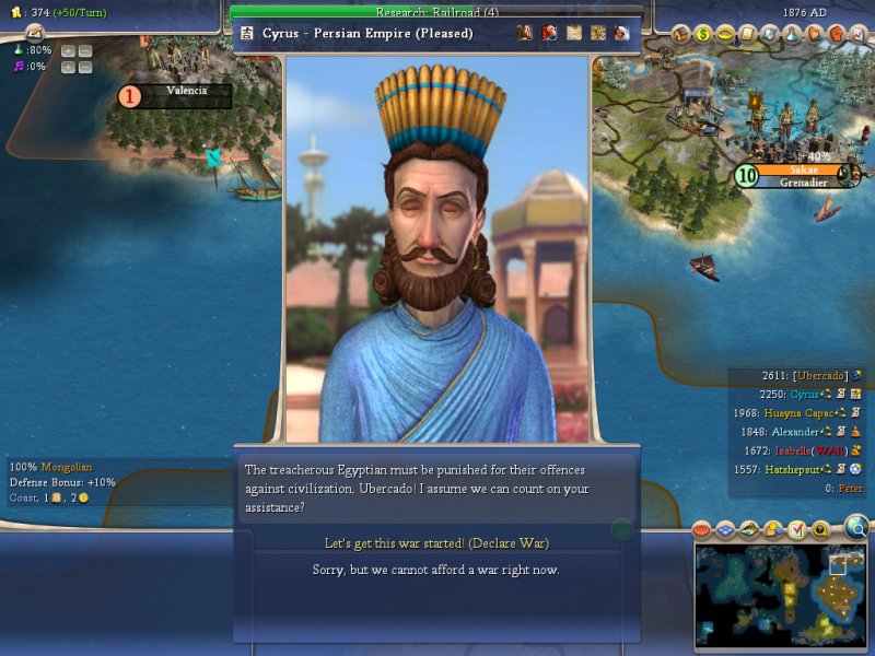 1886: Democracy is discovered, Fascism next. Switching to universal suffrage and emancipation. Valencia has a rifleman now, so our knights cant conquer it.