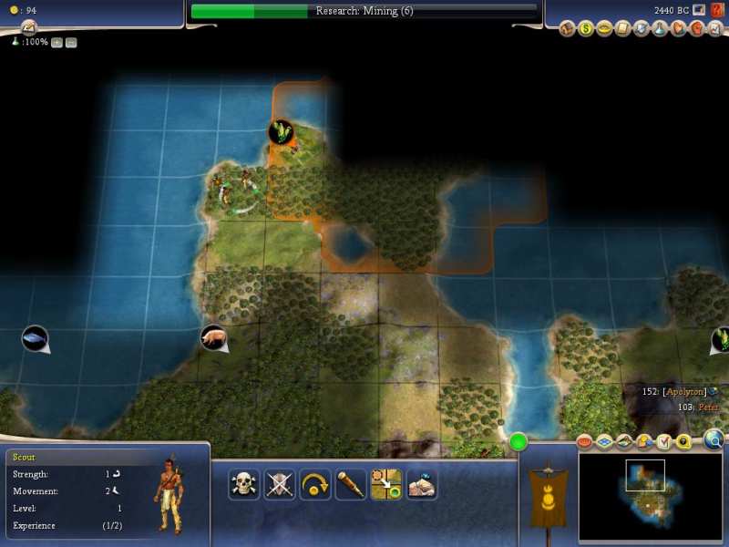 I opened the save up before work to start thinking about what to do. I will get our 2nd city up there to block Peter assuming he doesn't settle there first. I found a spot where we only need one culture growth to completely block land movement and will still have access to the 2 resources up there, forget what they are, pigs maybe and a luxury type?