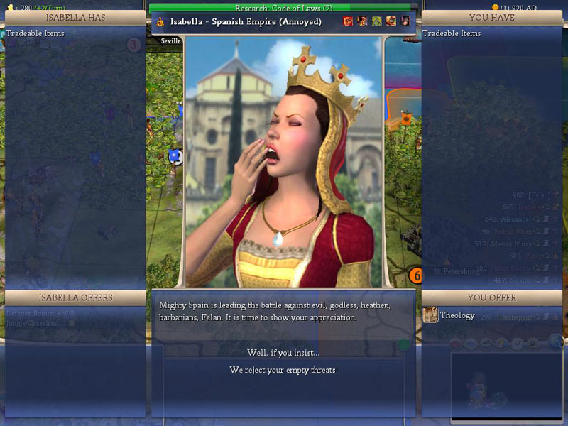 Kublai Khan is asking us to stop trading with the Germans. Alexander has in the past asked us to do this as well. We decide the Germans are making too many enemies and agree to stop trading with them.