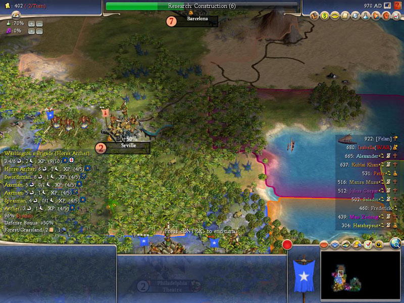 Since we have seven turns till Construction is done and then however long after that to get catapults built and as in a symbolic gesture we send Washington's Brigade forward to attack Seville and just manage to kill a defending archer.