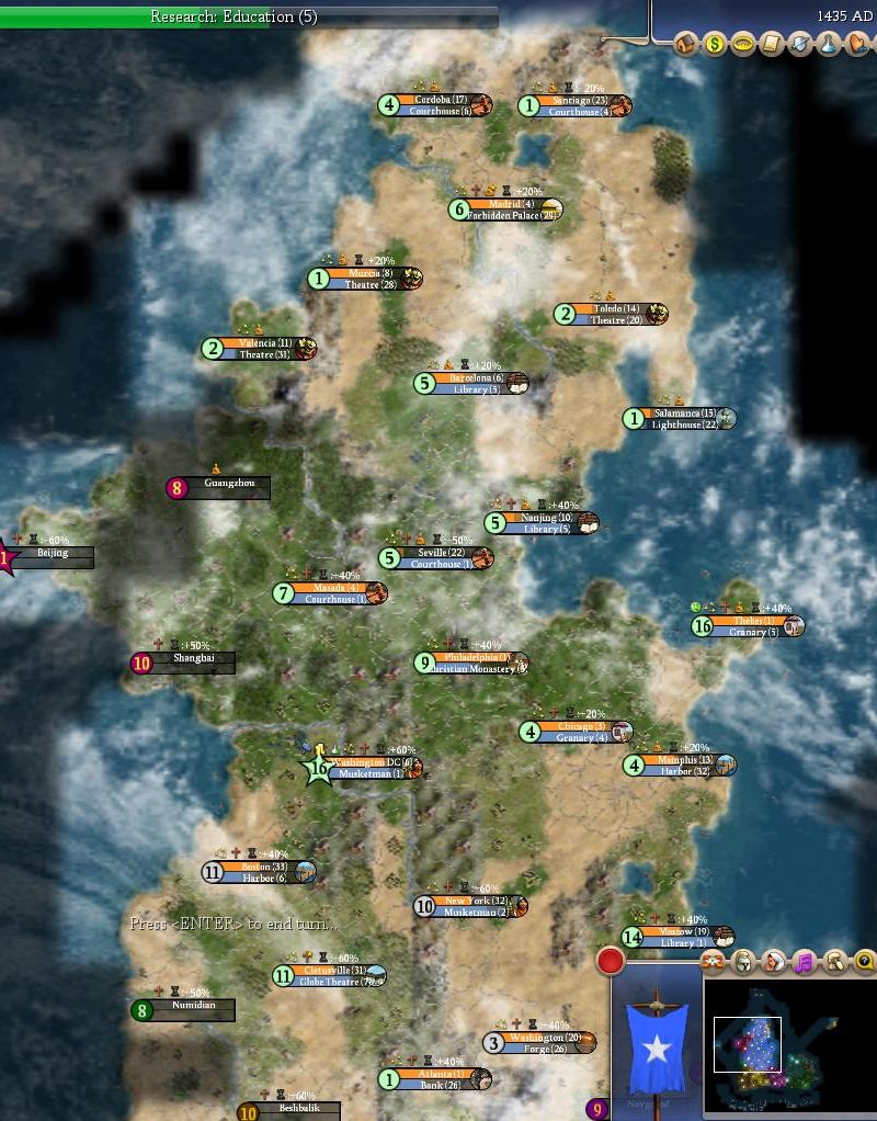 1440 AD: DC builds a musket man they start another one. I start a aquaduct in masada. Islam is founded in Antium. Granary seville. Work on infastruckter.