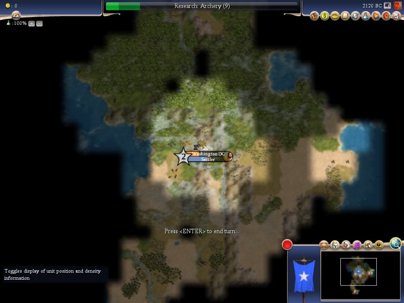 1850 BC - The Band's suspicions that they were being stalked were realized when they were attacked in the wee hours of the morning. We call these creatures Panthers and the pelt from the largest has been sent to the wise king and is a proud display of the might of America. So inspiring is this pelt that the people have discovered Archery (coincidentally the research finished the same turn). Unfortunately the meat doesn't compare to bacon. During the battle against the panthers several weapons were broken and men lost their lives, so this king has directed his people to look for stronger materials to fashion into weapons (bronze working). Recognizing the danger of arrows the Band has also learned how to take cover from them while they recover their strength and numbers.
